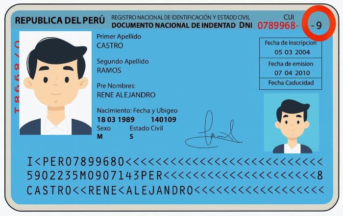 DNI electrónico: el dígito verificador aparece después de los ocho dígitos del número de DNI. En los documentos emitidos hasta 2019, se encuentra al lado izquierdo; en los emitidos desde 2020, está ubicado en la parte superior derecha.